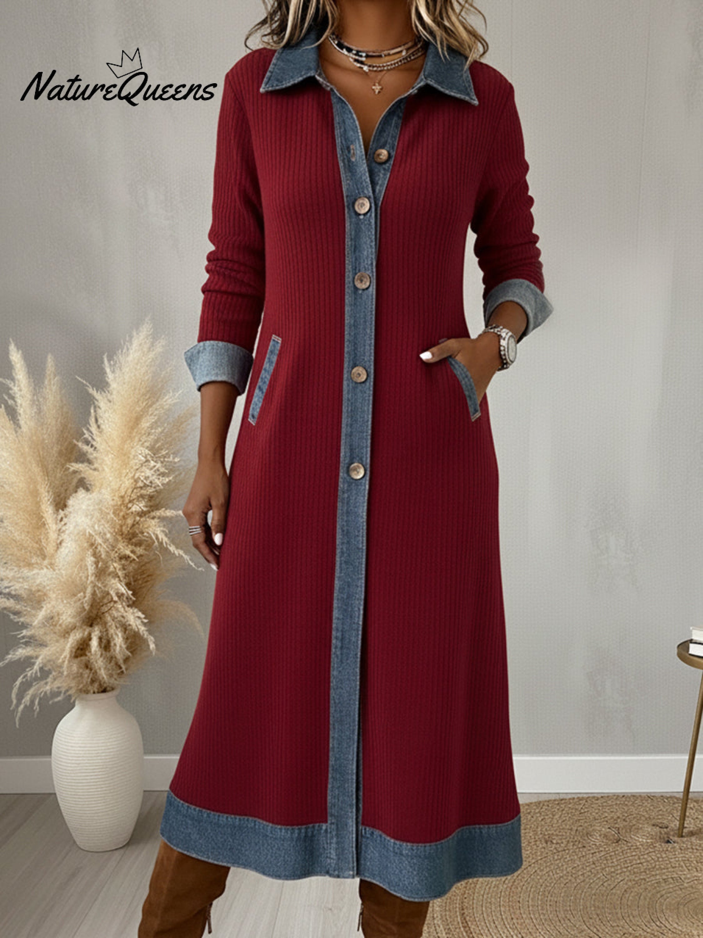 Casual Denim Patchwork Corduroy A-line Midi Dress