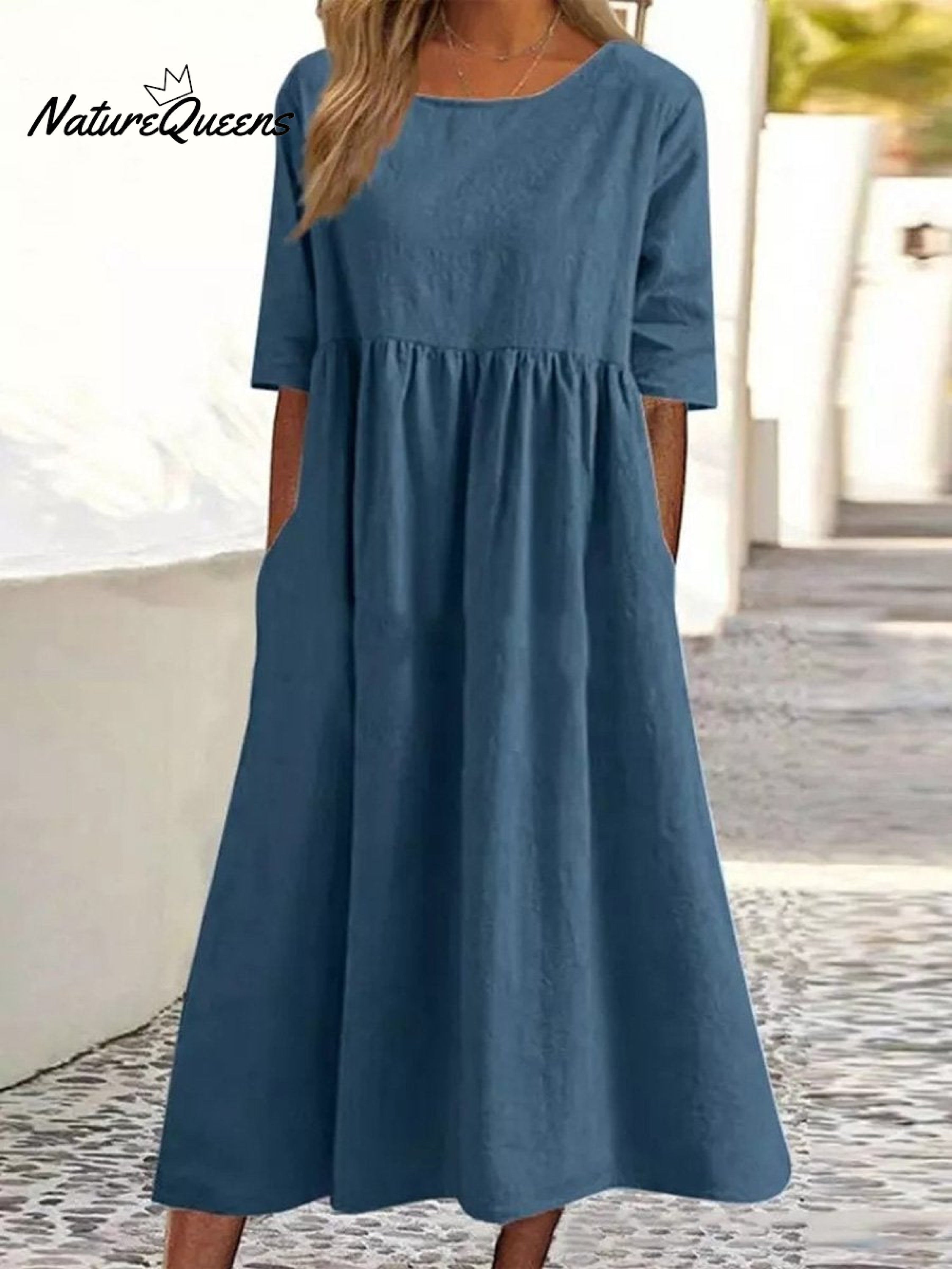 Cotton And Linen Casual Short Sleeve Pocket Pleated Loose Round Neck Dress