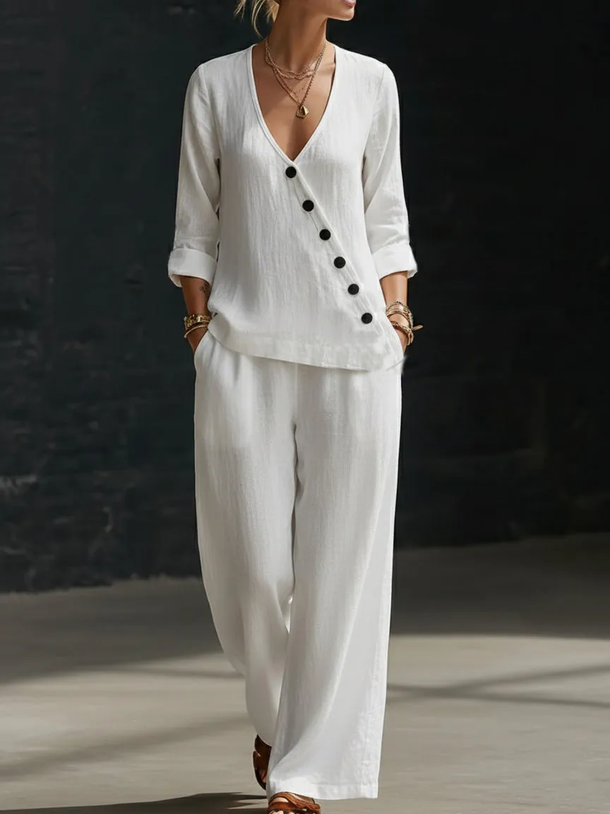 CLEARANCE SALE🔥 Minimalist V-neck Shirt And Wide-leg Pants Two-piece Set